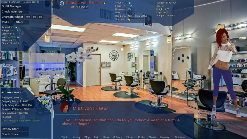 The morning alarm buzzes in the lab’s modest living quarters. First stop: the main terminal. A review shows that Serum “Theta” is 80% researched, and Lily’s resistance metrics are trending down—perfect. After a quick coffee, I find Lily in the gym. A brief chat confirms she’s amenable to another session. In the lab, I finalize the Theta formula and prepare a dose. The injection is administered in the med bay; I watch the stats carefully as drowsiness takes effect, but the target neuro-receptivity spike appears. Success! I log the data, which completes the research node. A new prompt appears: “Unlocked: Advanced Behavioral Modifiers.” The rest of the day is spent directing other characters to synthesize more precursor chemicals and running standard physicals to keep everyone’s baseline data fresh. As evening falls, a new story event triggers: the normally reserved Maya asks to speak privately about “strange dreams” she’s been having—a direct consequence of that unlocked research tree. The day ends with a new tool in my arsenal and a new narrative thread to pull.