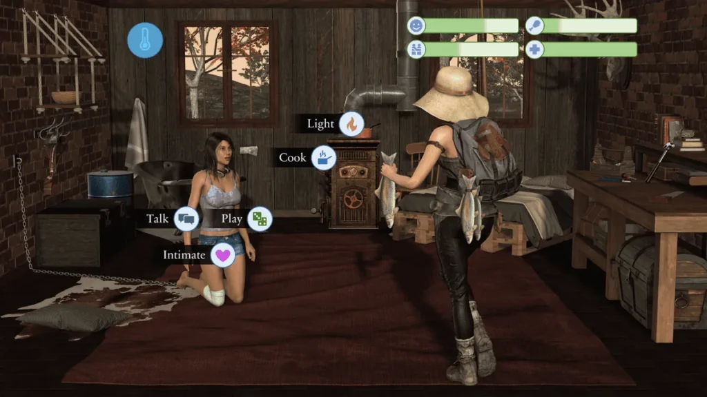 Choosing to shelter her transforms the game from a standard survival sim into something profound. Your goal shifts from mere existence to rehabilitation. You’re not just a survivor; you become a teacher. The gameplay loop beautifully mirrors this new purpose. You’ll spend your days managing cabin resources, but now you also have sessions where you patiently try to re-teach basic human functions. We’re talking about guiding her to say words, play simple games, remember how to brush her teeth, and understand her own body.